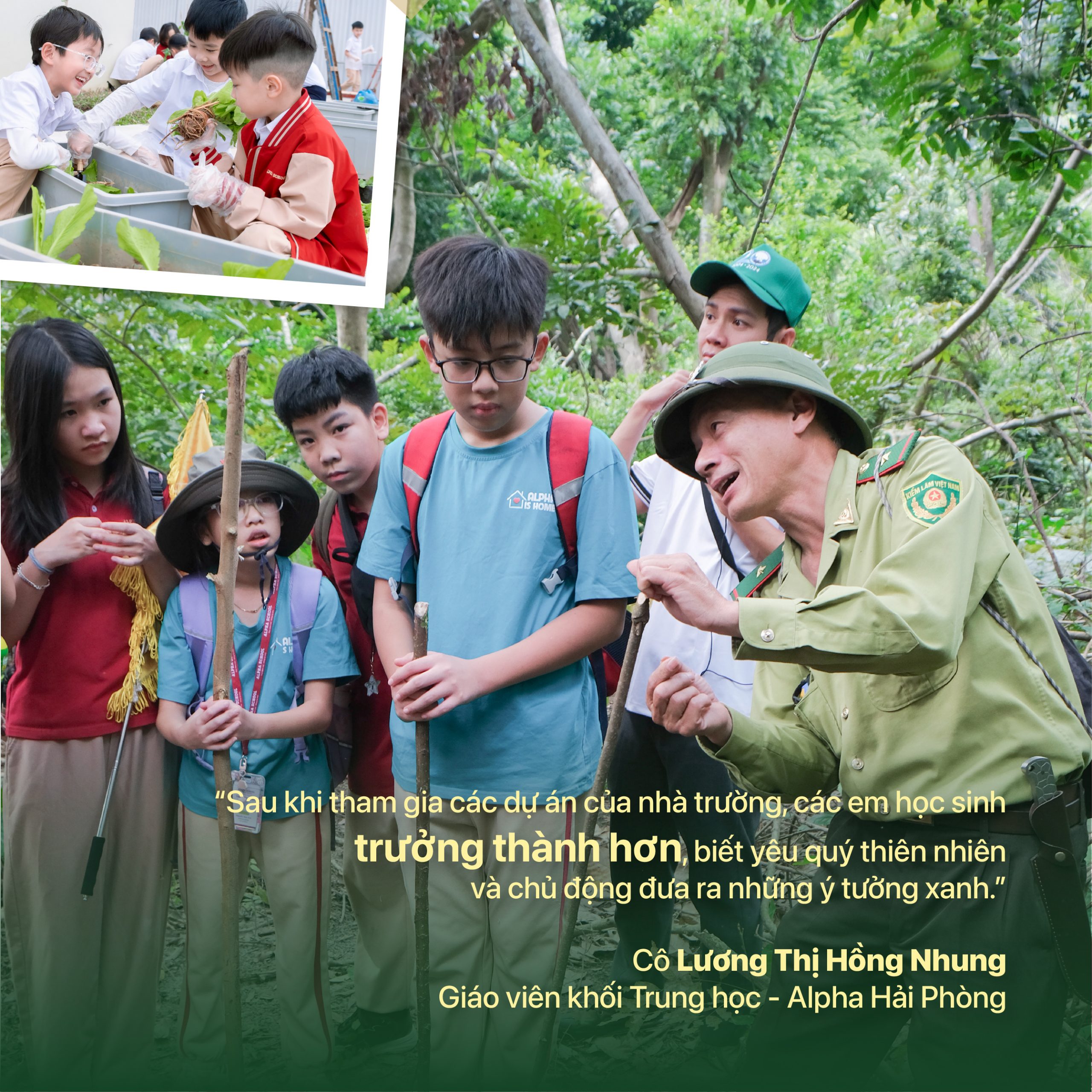 Là ngôi trường theo đuổi định hướng học tập qua trải nghiệm, Alpha Hải Phòng (thành viên Tập đoàn Giáo dục EQuest) lựa chọn cách tiếp cận giáo dục xanh bắt đầu từ việc đưa học sinh ra khỏi không gian lớp học, đặt các em vào mối quan hệ trực tiếp với thiên nhiên, cộng đồng và những vấn đề rất thật của địa phương.