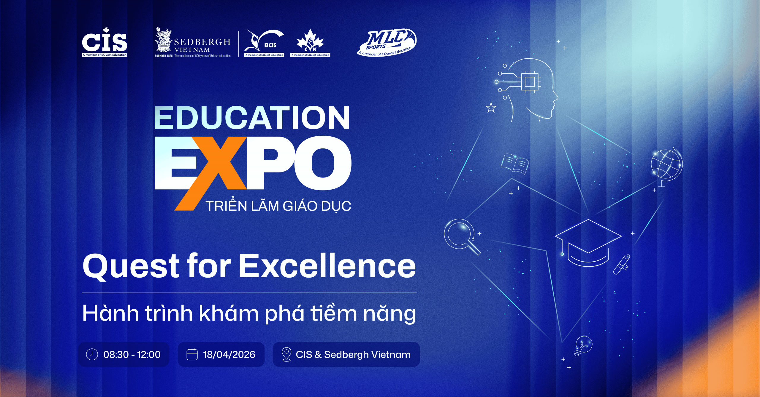 Hệ thống Trường Quốc tế Canada CIS và Sedbergh Vietnam (thành viên Tập đoàn Giáo dục EQuest) công bố sự kiện “Education Expo: Quest for Excellence” – dự kiến diễn ra vào sáng ngày 18/04/2026. Đây không đơn thuần là một triển lãm giáo dục thông thường – mà là sự kiện đánh giá năng lực chuẩn quốc tế toàn diện đầu tiên tại Việt Nam, nơi mỗi học sinh được tiếp cận một hành trình khám phá tiềm năng bằng các công cụ đo lường khoa học từ Cambridge, Oxford và Gallup.