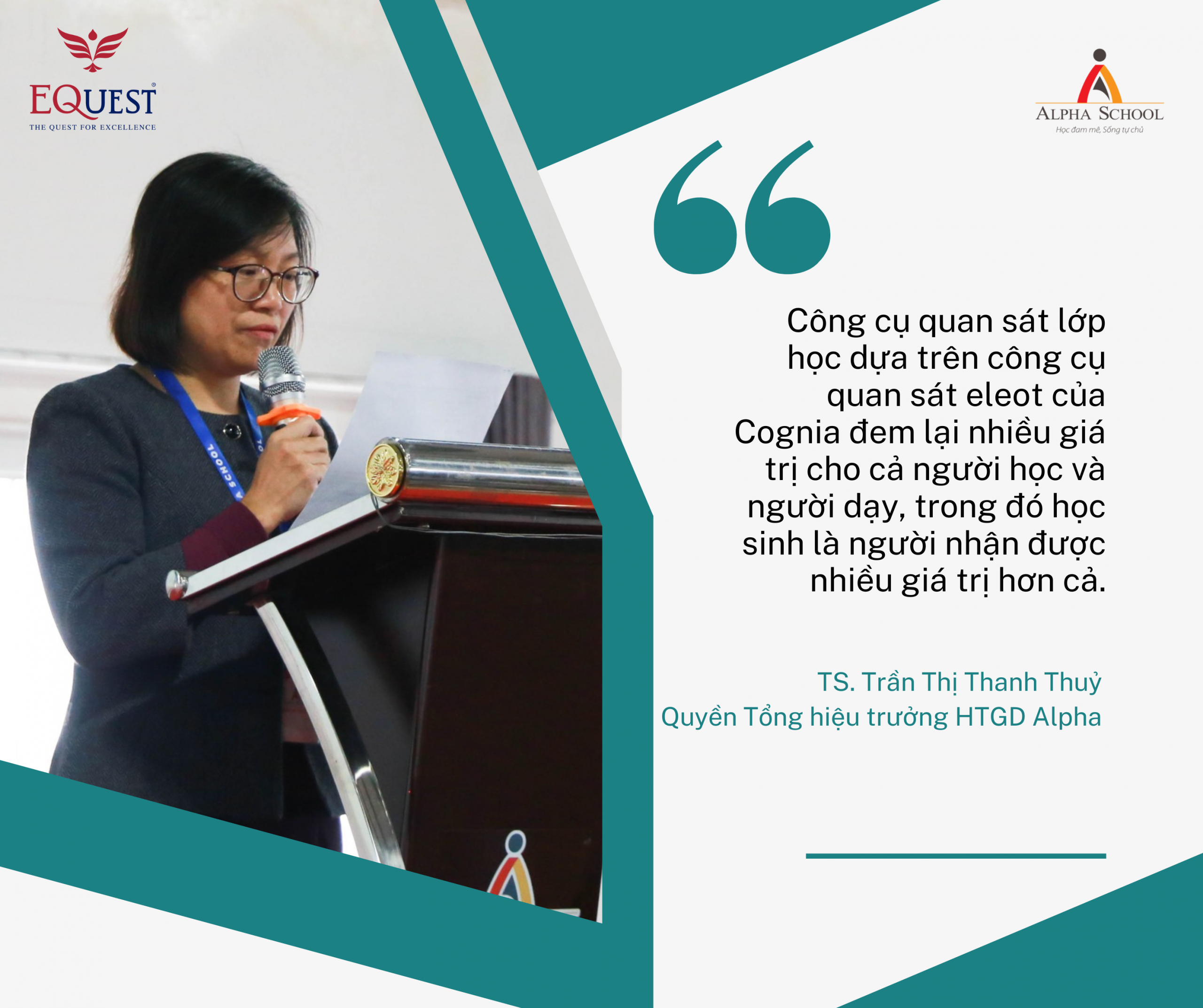 TS.Trần Thị Thanh Thủy – Quyền Tổng hiệu trưởng HTGD Alpha đánh giá công cụ quan sát lớp học dựa trên công cụ quan sát eleot của Cognia đem lại nhiều gia trị cho cả người học và người dạy, trong đó học sinh là người nhận được nhiều giá trị hơn cả vì các tiêu chí quan sát đều hướng vào người học với mục đích cải thiện môi trường học tập cho người học, từ đó tạo ra cơ hội học tập bình đẳng, phân hoá – một môi trường thực lấy học sinh làm trung tâm.